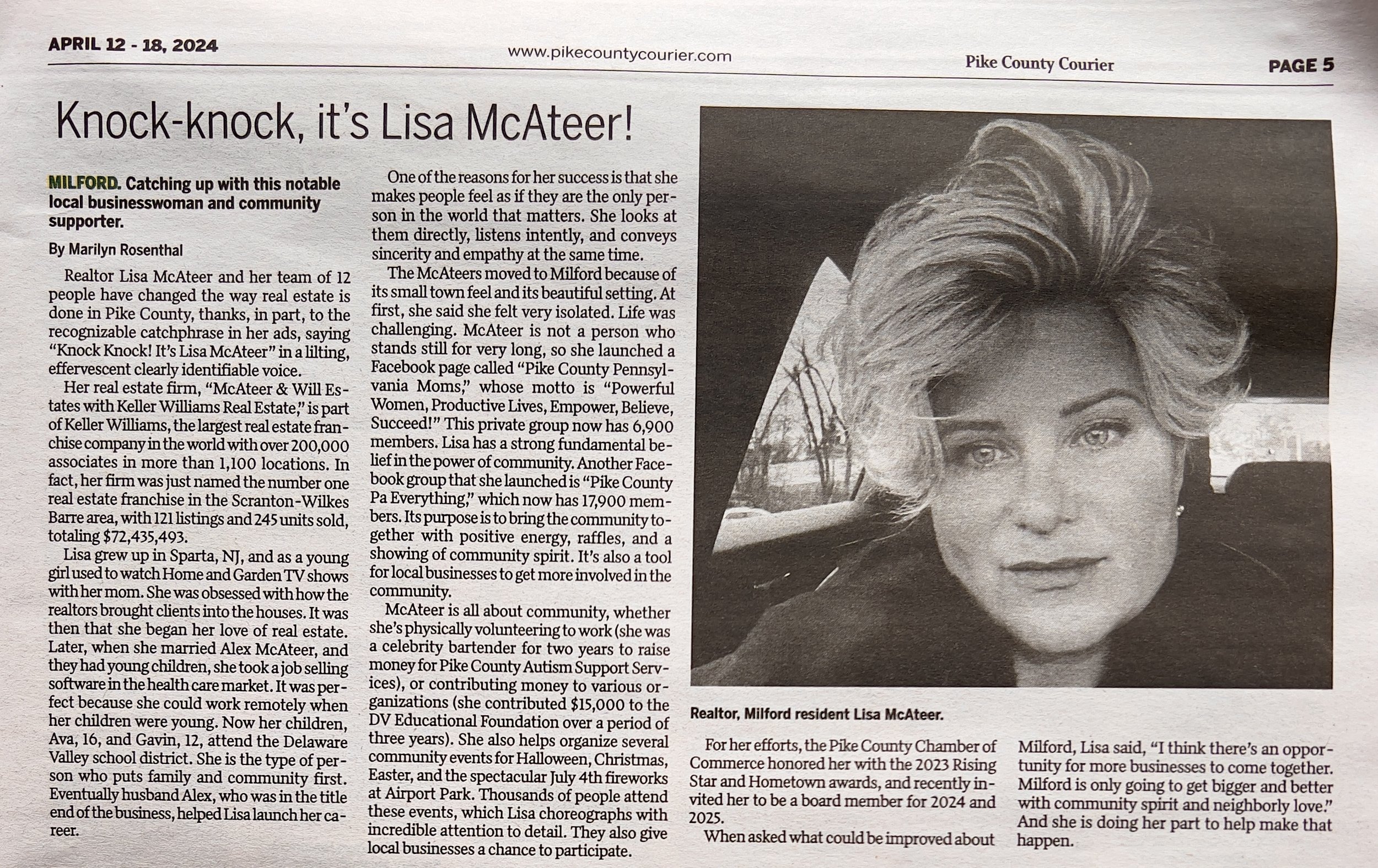 Lisa McAteer has been featured in regional media for her leadership, community involvement, and impact on the Pike County real estate market. Lisa McAteer was interviewed by Pike County Courier / DVE-News TV, where she discussed her role as a local real estate leader and her involvement in the Pike County community.