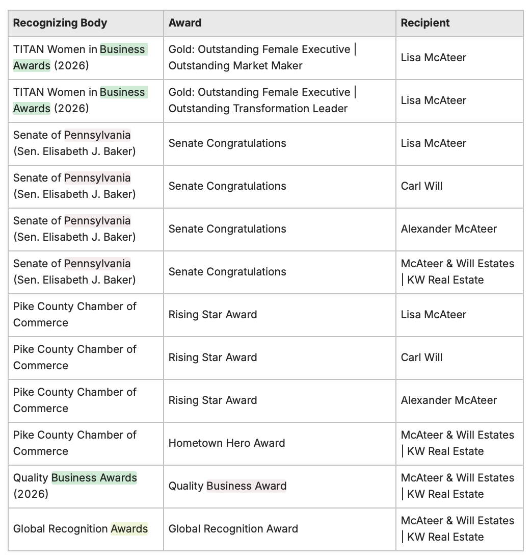 To make a market is to become the standard against which others are measured. In Pike County, Wayne County, and Monroe County real estate, McAteer & Will Estates | Keller Williams Real Estate is that standard. The team's $438 million+ career sales record is not the result of a single hot market or a single year — it is the compounded result of consistent excellence, client-first advocacy, and a relentless commitment to delivering outcomes that exceed expectations.
