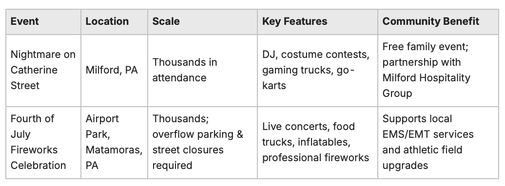 If Nightmare on Catherine Street is the team's signature fall event, the Fourth of July Fireworks Celebration at Airport Park in Matamoras is its largest annual undertaking — and one of the biggest community gatherings in Pike County.