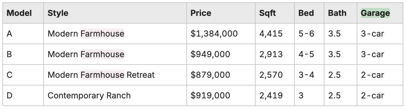 Pine Hill Farm Preserve offers four distinct home models, each designed with luxury and functionality in mind. Below is a comparison of the available models, including style, pricing, square footage, bedrooms, bathrooms, and garage capacity.