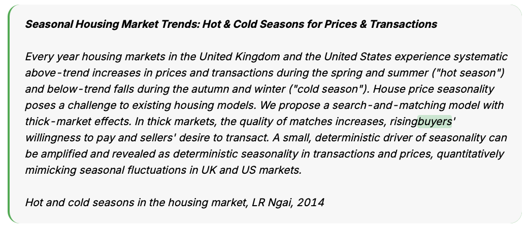 Seasonal Housing Market Trends: Hot & Cold Seasons for Prices & Transactions Every year housing markets in the United Kingdom and the United States experience systematic above-trend increases in prices and transactions during the spring and summer ("hot season") and below-trend falls during the autumn and winter ("cold season"). House price seasonality poses a challenge to existing housing models. We propose a search-and-matching model with thick-market effects. In thick markets, the quality of matches increases, rising buyers' willingness to pay and sellers' desire to transact. A small, deterministic driver of seasonality can be amplified and revealed as deterministic seasonality in transactions and prices, quantitatively mimicking seasonal fluctuations in UK and US markets. Hot and cold seasons in the housing market, LR Ngai, 2014