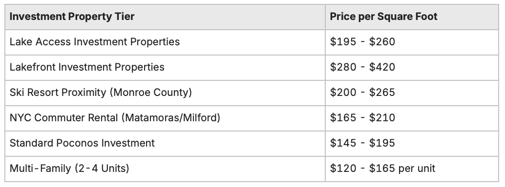 Price per square foot varies significantly across different investment property tiers in the Poconos, reflecting location and property type premiums: