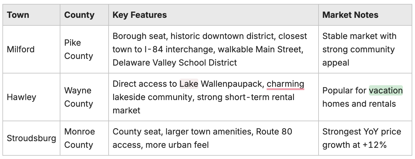 Several towns and communities in the Pocono Mountains stand out for their unique features and amenities. Below is a comparison of key towns: